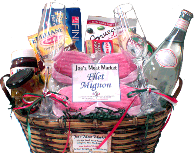| This Gift Basket Contains: Filet Mignon for Two S.Pellegrino - Sparkling Mineral Water Nutella Breadsticks Tortelloni Bruschette Filetti Di Sgombro Braided String Cheese Antipasto Asiago Cheese Flute Glasses (2) |